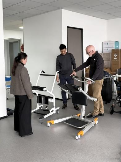 Tillsammans med våra relevanta rektorer diskuterade Mr. James två modeller av multifunktionella hissar för patientöverföring, inspekterade noggrant provstrukturer och genomförde prövningar på plats.